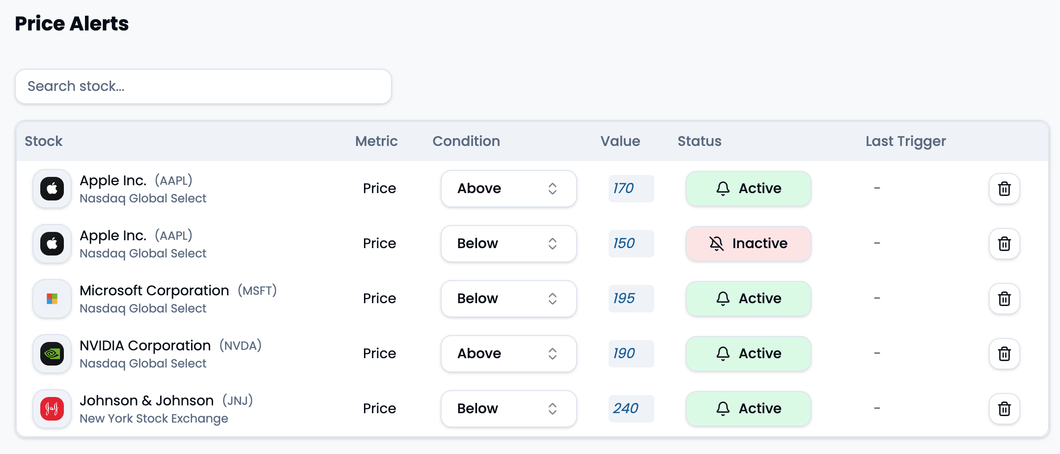 Puedes crear alertas en todas las acciones que quieras y gestionarlas todas desde la misma pantalla.